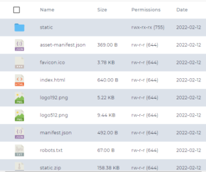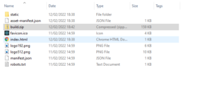 After running the above command, a new folder called “build” was created in the React development environment with the contents as shown below.